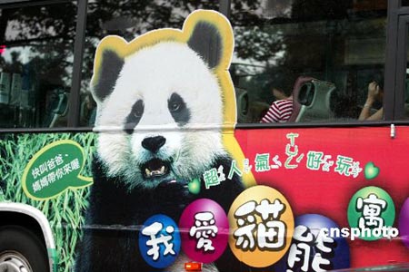 七月二十一日,一輛繪有大熊貓廣告畫的公共汽車在臺北忠孝東路上行駛。今年五月,大陸決定贈送臺灣大熊貓以來,在臺北民眾中掀起了大熊貓熱潮。作者:盛佳鵬