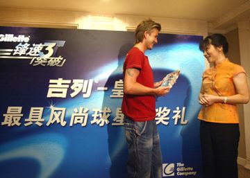 在他談到對“吉列-皇馬最具風(fēng)尚球迷評選”決賽的三個候選人的看法時,他說:“如果你的球迷不僅僅能夠欣賞你踢球的動作,也能夠理解你的個人風(fēng)尚,這對于一個球員來說真是太棒了!”之后他為由在場媒體評委選出的最具風(fēng)尚的球迷頒發(fā)了獎杯。據(jù)悉此前貝克漢姆剛剛在“皇馬中國行”官方網(wǎng)站上舉行的“吉列-皇馬最具風(fēng)尚球星評選”中獲得了最具風(fēng)尚球星的稱號,并且在中央電視臺的《天下足球豪門周-皇家馬德里專場》中接受了吉列公司市場總監(jiān)謝冰先生的頒獎,因此由他來給最具風(fēng)尚的球迷頒獎,顯然是順理成章。