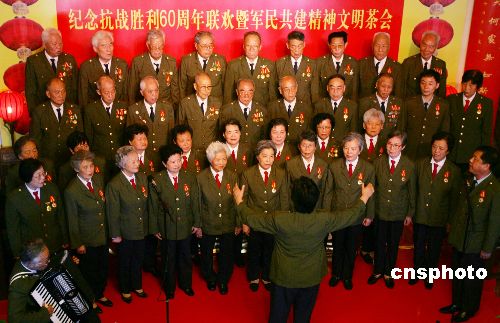 駐滬空軍某部的老干部與上海部分“老八路”,七月二十三日聚首浦東出席“紀念抗戰(zhàn)勝利六十周年軍民茶會”,這些佩帶英雄勛章的“老八路”平均年齡達八十歲,當他們高聲唱響“抗戰(zhàn)老歌”的時候,贏得全場陣陣掌聲。作者:湯彥俊