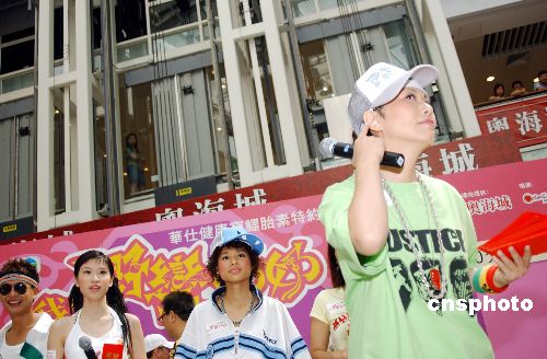 近期在香港熱播的電視劇《我的野蠻奶奶》劇組演員,7月24日在奧海城與觀眾近距離接觸,讓市民一睹眾明星風(fēng)采。圖為飾演奶奶的汪明荃一身?yè)u滾打扮登臺(tái)與觀眾會(huì)面玩游戲派“利是”。