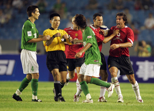 26日晚間,曼聯(lián)隊(duì)以3比0擊敗了北京國(guó)安隊(duì),不過(guò)本場(chǎng)比賽場(chǎng)上火藥味十足。第68分鐘,曼聯(lián)隊(duì)從左路進(jìn)攻,張帥一個(gè)非常危險(xiǎn)的飛鏟引起了曼聯(lián)隊(duì)員的強(qiáng)烈不滿,雙方球員糾纏一起,場(chǎng)面比較混亂,主裁判給了肇事者張帥一張黃牌。此后西爾維斯特鏟球時(shí)嚴(yán)重犯規(guī)放倒了高大偉,也被主教練黃牌警告。圖據(jù)華奧星空