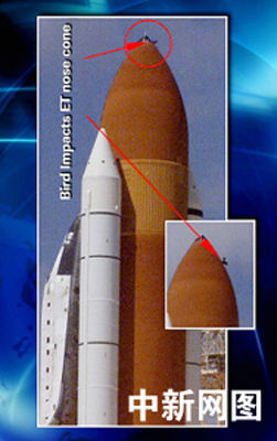 7月26日,美國“發(fā)現(xiàn)號”航天飛機從肯尼迪航天中心發(fā)射升空時,一只鳥在發(fā)射場附近飛過。當天下午的新聞發(fā)布會上,美國宇航局提供的一幅電視圖片顯示,一只鳥可能在“發(fā)現(xiàn)號”航天飛機發(fā)射的時候撞擊了燃料箱的最前端部分。與此同時,美國宇航局證實,在26日的發(fā)射升空過程中,“發(fā)現(xiàn)號”上脫落下來一小塊隔熱瓦和一大塊碎片!鞍l(fā)現(xiàn)號”底部擋熱板可能有兩處遭到了破壞。