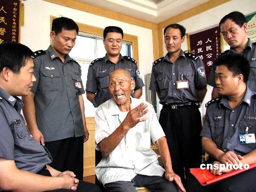 | 7月28日,83歲的抗日老英雄季長青(前中)來到山東棗莊市臺兒莊區(qū)公安分局泥溝派出所,為民警們上革命傳統(tǒng)教育課。季長青19歲參加抗日游擊隊(duì),后來加入了八路軍,日軍投降后,他跟隨大軍南下,參加過渡江戰(zhàn)役和解放上海的戰(zhàn)役。由于他作戰(zhàn)勇敢,多次立功受獎,在1947年光榮地加入了中國共產(chǎn)黨,自1953年從部隊(duì)轉(zhuǎn)業(yè)回到家鄉(xiāng)泥溝鎮(zhèn)東黃莊村后,便利用各種形式向青少年及當(dāng)?shù)氐母刹咳罕娏x務(wù)宣傳當(dāng)年抗日的故事,至今義務(wù)宣傳已達(dá)50多年。作者:賈禮章