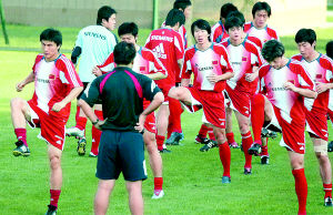 昨天傍晚5時(shí)30分開始的近兩個(gè)小時(shí)的訓(xùn)練中,朱廣滬拿出40分鐘的時(shí)間專門演練前場(chǎng)定位球。由于孫祥感冒沒有參加昨天的訓(xùn)練,罰角球的任務(wù)給了腳法秀麗的陳濤和鄭斌。
