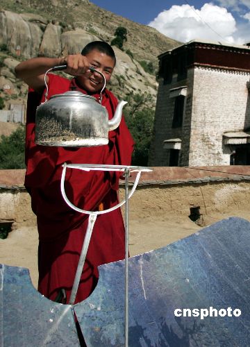 | 夏日的西藏色拉寺,一位僧侶在使用太陽能灶燒水。西藏自治區(qū)實(shí)施“陽光計(jì)劃”十多年以來,全區(qū)已累計(jì)建立三千瓦至五千瓦的光伏電站三百多座,推廣各類小型獨(dú)立光伏發(fā)電系統(tǒng)約五千四百千瓦,已有近五十多萬農(nóng)牧民因此告別了無電歷史。在西藏,太陽能資源已用于照明、通訊、廣播電視、燒水做飯、取暖等方面。作者:武仲林