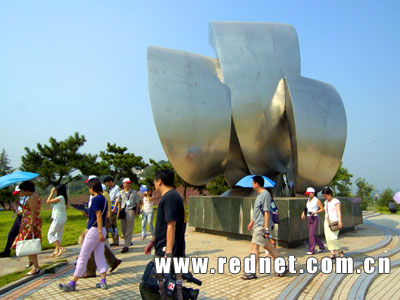記者們在蒸水風光帶從一尊名為“風調(diào)雨順”的雕塑下走過