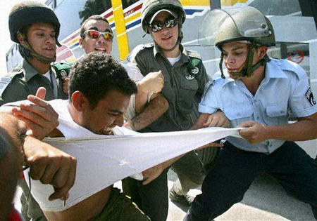 扮演拒不撤離的猶太定居者的警察被關(guān)進(jìn)鐵籠