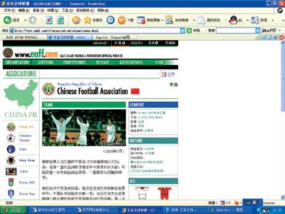 隨著中國(guó)男足、女足國(guó)家隊(duì)征戰(zhàn)東亞四國(guó)足球錦標(biāo)賽,關(guān)于東亞足聯(lián)這樣一個(gè)機(jī)構(gòu)也開始進(jìn)入人們關(guān)注的視線。但讀者劉先生昨天瀏覽東亞足聯(lián)官方網(wǎng)站()的時(shí)候,卻發(fā)現(xiàn):在介紹中國(guó)足協(xié)的頁(yè)面上,中國(guó)地圖上居然沒有臺(tái)灣省。該讀者稱,中國(guó)作為一個(gè)獨(dú)立的主權(quán)國(guó)家,在介紹中國(guó)足協(xié)的網(wǎng)頁(yè)上,中國(guó)地圖上居然漏掉寶島臺(tái)灣!這一點(diǎn)是讓中國(guó)人無(wú)法接受的。