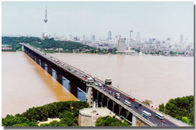 長(zhǎng)江大橋連結(jié)漢陽(yáng)和武昌的龜蛇二山,橫跨萬(wàn)里長(zhǎng)江之上。是我國(guó)長(zhǎng)江上第一座公鐵路兩用橋。它建于1955年9月,1957年10月正式通車。全橋長(zhǎng)1670。4米,正橋長(zhǎng)1156米,8墩9孔。橋身分為兩層,上層為公路橋,車道寬18米,可容6輛汽車并行;下層為鐵路雙軌橋,南北火車各行其道。鐵橋下凈高,在水位最高時(shí)仍可通行萬(wàn)噸巨輪。