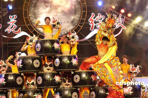 第七屆中國(guó)民間文藝山花獎(jiǎng)·民間藝術(shù)表演獎(jiǎng),八月六日晚在廣東東莞樟木頭降下帷幕,云南的《跳菜舞》、廣東湛江的《雷州雄師展英姿》、廣東東莞的《麒麟戲錢鼓》等十個(gè)作品獲得優(yōu)秀作品獎(jiǎng)。圖為廣東東莞樟木頭麒麟代表隊(duì)在閉幕式上表演他們的獲獎(jiǎng)作品《麒麟戲錢鼓》。作者:羅仰明