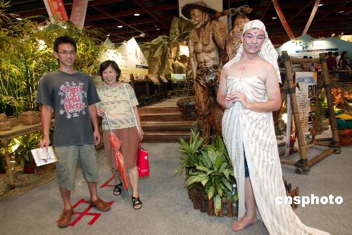 八月七日,在臺(tái)北世貿(mào)中心進(jìn)行的二零零五年臺(tái)北“中華美食節(jié)”進(jìn)入最后一天,眾多臺(tái)北市民抓住最后一天的時(shí)間,到美食節(jié)參觀、品嘗美食。圖為一個(gè)參展商采用另類的“美人魚”宣傳海鮮美食。作者:盛佳鵬
