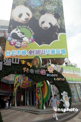 八月九日,臺(tái)北木柵劍湖山兒童玩國正在進(jìn)行“我愛貓熊寓教展”,其游樂設(shè)施從各個(gè)方面介紹大熊貓,供參觀者參觀。圖為臺(tái)北木柵劍湖山兒童玩國在門口樹立的大幅熊貓宣傳海報(bào)。作者:盛佳鵬