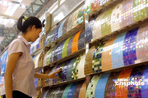 八月九日,在烏魯木齊舉辦的中國西部國際建筑裝飾博覽會(huì)展館內(nèi),一位市民被色彩華麗、款式多樣的彩色玻璃瓷磚所吸引。來自十九個(gè)國家的三百五十余家中外企業(yè)在本屆博覽會(huì)設(shè)立展位推介自己的產(chǎn)品,其中不乏新穎獨(dú)特的新型建筑裝飾材料。作者:劉新
