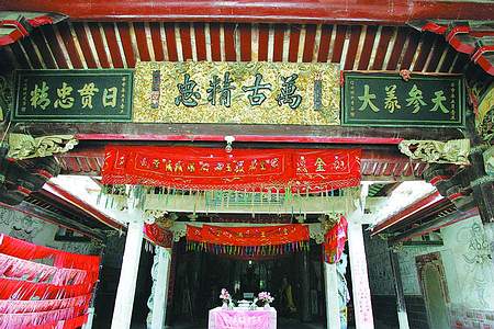 胡世成老人向記者講述鼎美與臺(tái)灣悠久淵源。正氣殿里的蟠龍柱上記載著,該殿為清代嘉慶年間重修,可見(jiàn)正氣殿的歷史要比清代嘉慶年更久遠(yuǎn)得多。這座關(guān)帝廟還是海峽兩岸同胞血脈情深的歷史見(jiàn)證。前不久,一位在廈門(mén)投資的臺(tái)灣企業(yè)界人士盧國(guó)山先生據(jù)先輩的傳聞尋訪到鼎美的關(guān)帝廟,盧先生感到興奮的不僅是看到這古村中竟藏著這么一座建筑精巧的古關(guān)帝廟,更重要的是他親眼印證了臺(tái)灣前輩的傳聞。原來(lái)盧先生家在臺(tái)南,先輩們一代一代地傳說(shuō)臺(tái)南的關(guān)帝爺來(lái)自同安的鼎美(鼎美古屬同安縣),其外觀建筑和內(nèi)部的神像雕塑全部以鼎美的關(guān)帝廟為范本,今天一見(jiàn)果然如此。盧先生驚喜之情溢于言表。他兒時(shí)在臺(tái)南度過(guò),關(guān)帝爺、赤兔馬、周倉(cāng)、關(guān)平,這些栩栩如生的形象深深地印在他的腦海里,現(xiàn)在鼎美關(guān)帝廟所見(jiàn)與臺(tái)南的一模一樣。其實(shí)是先有鼎美關(guān)帝廟,后有臺(tái)南關(guān)帝廟,原來(lái)根在這里。√貏e令他有感觸的是,正氣殿門(mén)柱上一副古人撰寫(xiě)的對(duì)聯(lián)“鼎室雖三分紫陽(yáng)特筆終歸漢;江山未一統(tǒng)華夏知名獨(dú)有公”,期盼國(guó)家統(tǒng)一,古人今人有著同樣的愿望。