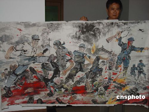 為紀(jì)念抗戰(zhàn)勝利六十周年,常德老畫家楊格正專心繪制其長幅畫卷《血戰(zhàn)常德》。整幅畫卷分為戰(zhàn)爭、救死扶傷、悼念三大部分,再現(xiàn)了當(dāng)年常德會戰(zhàn)的情景。目前,兩幅長兩米、高一米,描繪戰(zhàn)爭場面的畫幅已經(jīng)完成。作者:鄧霞