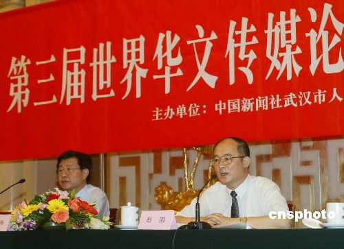 八月十二日,國務(wù)院僑辦副主任趙陽(右)、中共武漢市委副書記殷增濤(左)出席在北京人民大會堂舉行的“第三屆世界華文傳媒論壇”新聞發(fā)布會。由中國新聞社、武漢市人民政府主辦的“第三屆世界華文傳媒論壇”將于九月十一日在武漢市召開。作者:史利