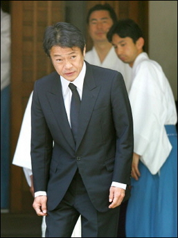 據(jù)香港媒體引述報道,在日本戰(zhàn)敗紀(jì)念日60周年前夕,中川昭一今日身穿黑色衣服,乘座駕抵達靖國神社參拜。他早前曾經(jīng)表示,參拜靖國神社是為了“祈求和平和誓言永不啟戰(zhàn)”。