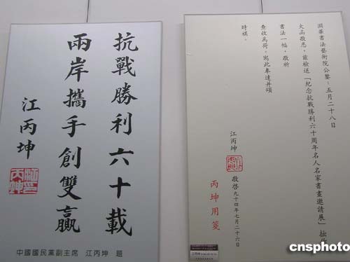 該展覽由中國(guó)國(guó)民黨連戰(zhàn)主席,書畫名家中國(guó)書法家協(xié)會(huì)沈鵬主席分別題寫展標(biāo),兩岸名人名家共同參與。在列展的180多件作品中,既有兩岸抗戰(zhàn)將軍凜凜正氣的題詞,又有涵蓋國(guó)際友人以及國(guó)內(nèi)17個(gè)省市書畫名家精心創(chuàng)作的以抗戰(zhàn)題材為主的書畫作品。本次展覽開展儀式結(jié)束后,現(xiàn)場(chǎng)還舉行了“兩岸攜手,共建和諧;勿忘國(guó)恥,振興中華”的萬人簽名活動(dòng)。