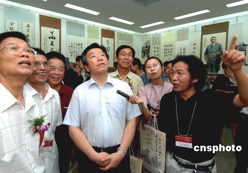| 為紀(jì)念抗日戰(zhàn)爭(zhēng)勝利六十周年、推動(dòng)祖國(guó)和平統(tǒng)一大業(yè),以“兩岸攜手,同紀(jì)抗戰(zhàn);共建和諧,共謀發(fā)展”為主題的《紀(jì)念抗日戰(zhàn)爭(zhēng)勝利六十周年名人名家書畫邀請(qǐng)展》,八月十四日在福州畫院隆重開展。本次展覽共展出十七個(gè)省市地區(qū)作品一百八十多件并專門設(shè)立臺(tái)灣展區(qū)。圖為中共福建省委書記盧展工(圖中)等各界人士出席開展式并觀展。作者:劉可耕