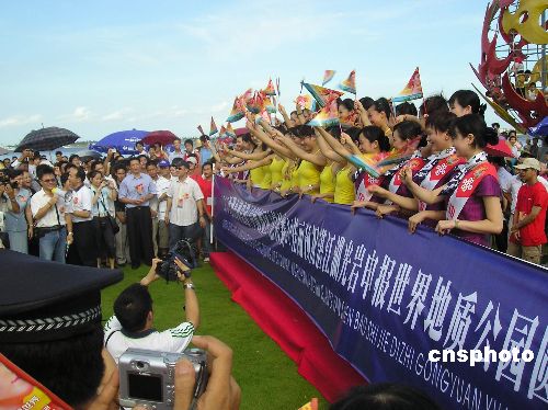 8月14日,2005年亞洲小姐(中國賽區(qū))進入總決賽的20名候選佳麗來到廣東湛江,傾情支持該市湖光巖申報世界地質公園。作者:馬燦