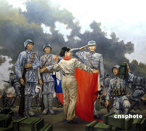 8月16日,《永恒的記憶--紀(jì)念中國人民抗日戰(zhàn)爭暨世界反法西斯戰(zhàn)爭勝利60周年京滬美術(shù)作品聯(lián)展》在上海美術(shù)館舉辦。畫家羅林創(chuàng)作的一幅體現(xiàn)抗日英雄謝晉元迎接冒險送國旗的童子軍楊惠敏的油畫在展會中展出。圖片拍攝:井韋