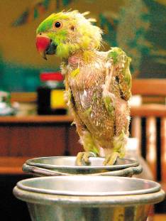 黃奕禎升上4年級(jí)后,因功課繁重,每天有寫不完的功課,還要補(bǔ)習(xí),沒時(shí)間再陪“雅腳”玩,每天放學(xué)回家,“雅腳”總是高興的跳著、叫著,她卻只能偶爾陪它玩一下,就趕著做功課,沒多久,竟發(fā)現(xiàn)“雅腳”開始掉毛,原以為是換毛,后來竟發(fā)現(xiàn)除了頭部,全身羽毛都快掉光了,并多次目睹“雅腳”用嘴啄著自己羽毛,一根根的拔掉,愈來愈丑。