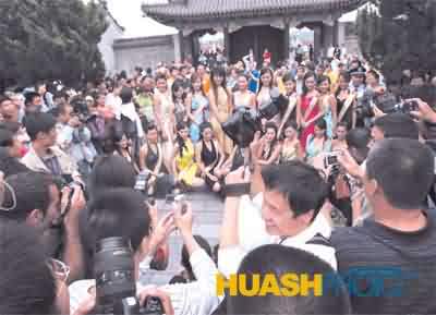 在現(xiàn)場(chǎng),攝影記者們更是排成行,一時(shí)間,參賽佳麗們被圍得水泄不通。佳麗們的美麗也吸引了不少老外的注意,他們舉著相機(jī),一邊喊“here”,一邊高興地拍照,等佳麗們面向他們時(shí),他們還趕忙舉起V形手勢(shì)表示歡迎。