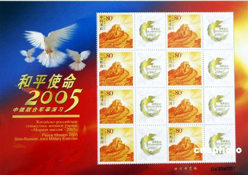 中俄聯(lián)合軍事演習(xí)導(dǎo)演部和中國集郵總公司19日聯(lián)合發(fā)行“和平使命—2005”中俄聯(lián)合軍事演習(xí)紀念封1枚和專題紀念封4枚,以紀念“和平使命—2005”中俄聯(lián)合軍事演習(xí)。這5枚紀念封以精裝卡書和簡裝卡書兩種方式裝幀。圖為精裝卡書中的一版8枚個性化郵票。作者:王麗南