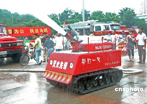 2005年8月21日上午,一輛坦克形狀的消防機器人在浙江省溫州市亮相,并在指揮人員的操控下現(xiàn)場進行演練,讓市民大開眼界。據(jù)了解,這輛無人駕駛的機器人可以在極度危險環(huán)境下開展滅火。作者:劉飛