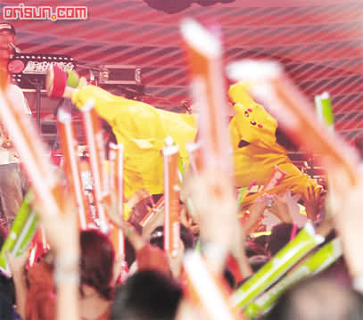 在壓軸合唱部分,達(dá)明換了睡袍造型,霆鋒不示弱,即場脫衣拋下臺,露出當(dāng)年和王菲“比翼雙飛”愛的紋身,又用水淋頭,拗腰彈跳;high到震的他,然后用國語連問兩次站在臺前的大陸fans:“你們會接我嗎?”即飛身下臺,全場嘩然,霆鋒和前排觀眾跌在一堆,形成一個凹字,嚇到正在唱歌的明哥目瞪口呆,馬上叫大會:“停一停音樂!泵蛦枺骸蚌h有沒事?”現(xiàn)場燈光大,保安和助手紛紛走近察看霆鋒,隔了半分鐘,霆鋒才跳上臺,連鞋都甩開,赤腳說:“不好意思,讓大家擔(dān)心,你們有沒事?我還好,如果你們有事,我不會再在香港演出,你們真的OK?”幸沒人受傷,不致樂極生悲。