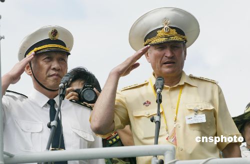 “和平使命-2005”中俄聯(lián)合軍事演習第三階段8月23日在中國山東半島及其附近海域開始。圖為俄羅斯太平洋艦隊司令費奧多羅夫(右)與中國海軍北海艦隊司令員張展南向受閱艦艇行軍禮。作者:王麗南