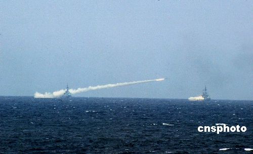 八月二十三日,“和平使命——2005”中俄聯(lián)合軍事演習(xí)第三階段在中國山東半島及其附近海域進行。圖為多艘護衛(wèi)艦齊射艦艦導(dǎo)彈。作者:王麗南
