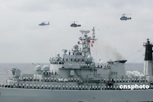 “和平使命-2005”中俄聯(lián)合軍事演習(xí)第三階段8月23日在中國山東半島及其附近海域舉行。圖為中俄艦機編隊接受聯(lián)合導(dǎo)演部檢閱時,中方艦艇駛過觀摩艦時情景。作者:王麗南