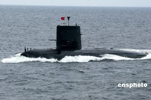 “和平使命-2005”中俄聯(lián)合軍事演習第三階段8月23日在中國山東半島及其附近海域開始,圖為中國潛艇駛過觀摩艦接受聯(lián)合導演部檢閱。作者:王麗南