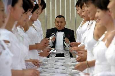 昨天,奧體中心游泳館的一個(gè)平臺(tái)上,一下子出現(xiàn)了三十位身穿白色婚紗的新娘,這個(gè)場(chǎng)面難道是有人在這里組織集體婚禮?看到一旁的攝影機(jī),才知道原來這里是潘長(zhǎng)江處女專輯《男人40一枝花》同名歌曲MV的拍攝現(xiàn)場(chǎng)。一張長(zhǎng)條桌子兩側(cè)站著30位漂亮的新娘,而眾星捧月之中是身穿黑色燕尾服的笑星潘長(zhǎng)江。最搞笑的是當(dāng)老潘揭開面前一只巨大的盤子蓋,原以為是大餐的他失望地發(fā)現(xiàn)里面只放著一個(gè)小漢堡。