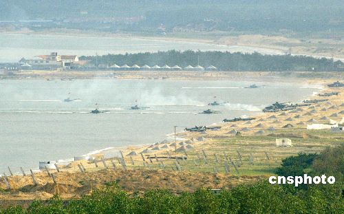 八月二十四日,“和平使命—2005”中俄聯(lián)合軍事演習第三階段兩棲登陸作戰(zhàn)實兵演練在山東半島展開。圖為兩棲登陸作戰(zhàn)實兵演練的裝甲車向岸防沖擊。作者:王麗南