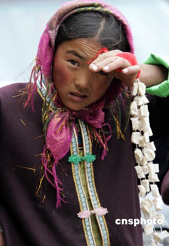 由于越來越多的游客光顧神秘的世界屋脊--西藏,當?shù)卦絹碓蕉嗟牟刈迦松孀懵糜畏⻊?wù)業(yè)的新領(lǐng)域。一名藏族女孩于今年旅游旺季在通往江孜古城的路旁飯店出售藏族傳統(tǒng)食品——奶塊,由于剛剛?cè)氲溃幻庥行┖π。(作者:任晨鳴)