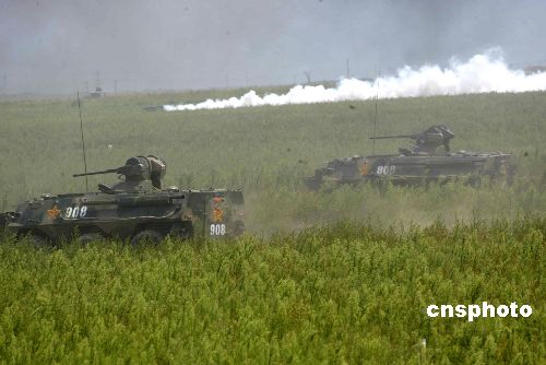 中新社濰坊八月二十五日電(記者陶社蘭)“和平使命-二00五”中俄聯(lián)合軍事演習(xí)最后一個(gè)實(shí)兵行動(dòng)課目——強(qiáng)制隔離作戰(zhàn)演練,今天上午在濟(jì)南軍區(qū)濰北靶場(chǎng)舉行。