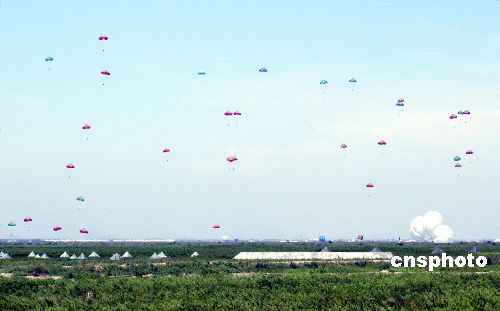 “和平使命——2005”中俄聯(lián)合軍事演習強制隔離演練8月25日在山東半島舉行。圖為中國空降傘兵跳傘,彩色傘花飄滿天空。作者:王麗南
