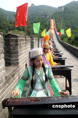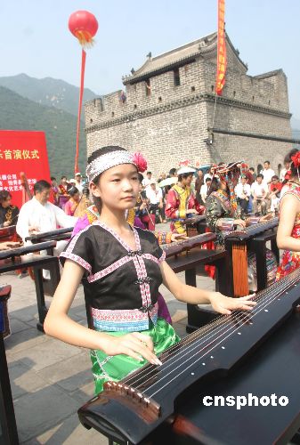 八月二十六日,居庸關(guān)長城琴聲悠揚(yáng),身著56個民族盛裝的古琴演奏者,在天下第一雄關(guān)用鐫刻著56個民族歷史文化和風(fēng)情習(xí)俗的56把極品古琴演奏了《梅花三弄》、《流水》、《關(guān)山月》《歌唱祖國》等千古名曲和時代新歌,慶祝中華人民共和國建國56周年。張勤