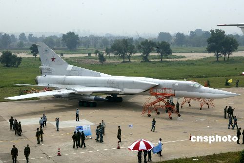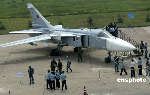 中新網(wǎng)8月26日電 26日上午,參加“和平使命-2005”中俄聯(lián)合軍事演習的俄羅斯空軍裝備在青島流亭機場進行展示。中共中央政治局委員、中央軍委副主席、國務(wù)委員兼國防部長曹剛川觀看展覽。