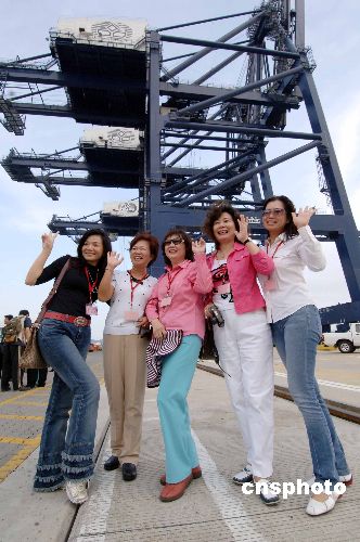 八月二十七日下午,中國國民黨臺南市黨部參訪團一行在深圳市市長許宗衡的陪同下,先后來到深圳仙湖植物園、鹽田港集團、大梅沙海濱參觀。圖為中國國民黨臺南市黨部參訪團女團員在鹽田港留下美麗倩影。作者:陳文
