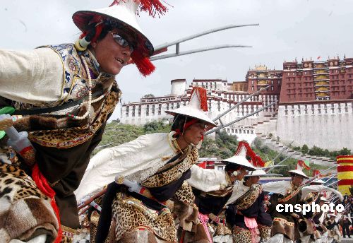 八月二十八日,西藏自治區(qū)成立四十周年大型游行彩排活動在拉薩舉行,圖為藏族人民在布達(dá)拉宮廣場盛裝起舞。作者:張宇