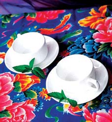 白色的骨瓷茶具搭配藍(lán)色大花布餐墊,細(xì)膩和熱烈奇妙地結(jié)合在一起。把藍(lán)印花布按照所需尺寸裁剪,然后將周邊仔細(xì)縫好熨平,就做成了樸實(shí)無(wú)華的餐墊。