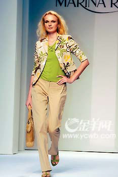 幾大品牌紛紛提倡“拜金”,卻各有“金招”,其中最出位的要屬M(fèi)ARINA RINALDI。但見普通的白襯衫被釘上了金色鉚釘,休閑長褲的外側(cè)爬滿金光閃閃的蝴蝶與花草,長長的頸巾布滿了金色閃片,針織背心的肩頭被金屬片飾加以勾勒,就連風(fēng)衣前襟都散落著大大小小的金屬閃片,令人拍案叫絕。