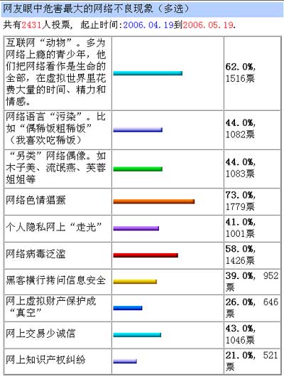 中新網(wǎng)5月9日電 在互聯(lián)網(wǎng)快速發(fā)展的同時,個別網(wǎng)站也存在著傳播不健康信息、刊載格調(diào)低下的圖片、提供不文明聲訊服務,甚至傳播“黃色”內(nèi)容等嚴重危害社會的問題。就“互聯(lián)網(wǎng)現(xiàn)存的最顯著不良現(xiàn)象”這一話題,新華網(wǎng)最近發(fā)起大規(guī)模網(wǎng)上調(diào)查活動。