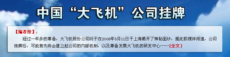 | “中國的汽車、遠洋貨輪、載人航天都有自己的品牌產(chǎn)品,而中國大飛機卻至今沒有,作為航空人,我感到很慚愧!毙氯稳珖䥇f(xié)委員、中國航空工業(yè)第一集團公司第一飛機設(shè)計研究院院長吳光輝接受中新社記者專訪,對中國大飛機的研制感觸頗深……<詳細> |