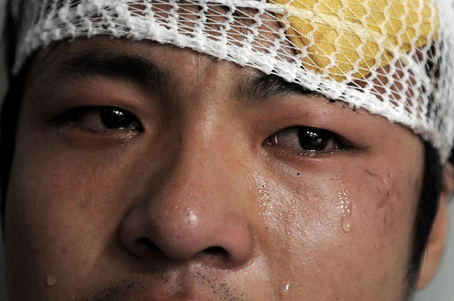 7月6日,新疆烏魯木齊友誼醫(yī)院,來自北京的小伙兒趙剛在病床上回想起昨夜的暴力事件泣不成聲。24歲的趙剛是專程來烏市看望女友的,在5日的暴力事件中被犯罪分子毆打成腦震蕩。中新社發(fā) 廖攀 攝