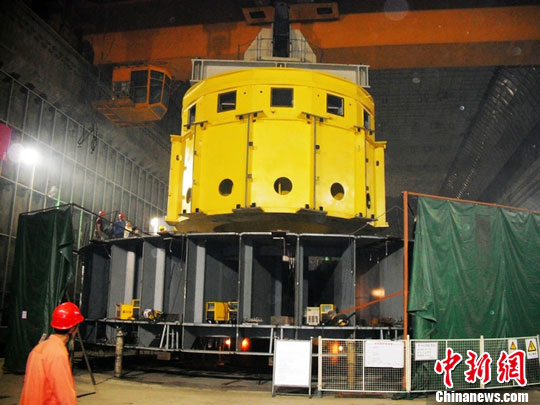 中新網(wǎng)宜昌8月7日電 (上官純青 高松)7日下午,三峽地下電站在建的6臺70萬千瓦發(fā)電機(jī)組第一臺轉(zhuǎn)子中心體運抵廠房進(jìn)行了安裝。