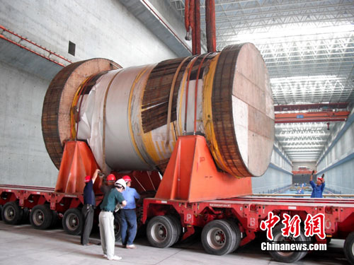 9日,由東方電機(jī)廠、哈海濱電機(jī)廠、天津阿爾斯通水電設(shè)備有限公司分別承建的3臺(tái)每臺(tái)重達(dá)百?lài)嵉娜龒{地下電站水輪發(fā)電機(jī)主軸,由有96個(gè)車(chē)輪的特種車(chē)輛運(yùn)載,在三峽壩區(qū)交警全程護(hù)運(yùn)下,從江北重件倉(cāng)庫(kù)出發(fā),橫跨西陵長(zhǎng)江大橋,陸運(yùn)12公里順利抵達(dá)三峽右岸電站廠房先期調(diào)試,確保穩(wěn)定正常工作后,預(yù)計(jì)下月再轉(zhuǎn)移安裝到地下電站。